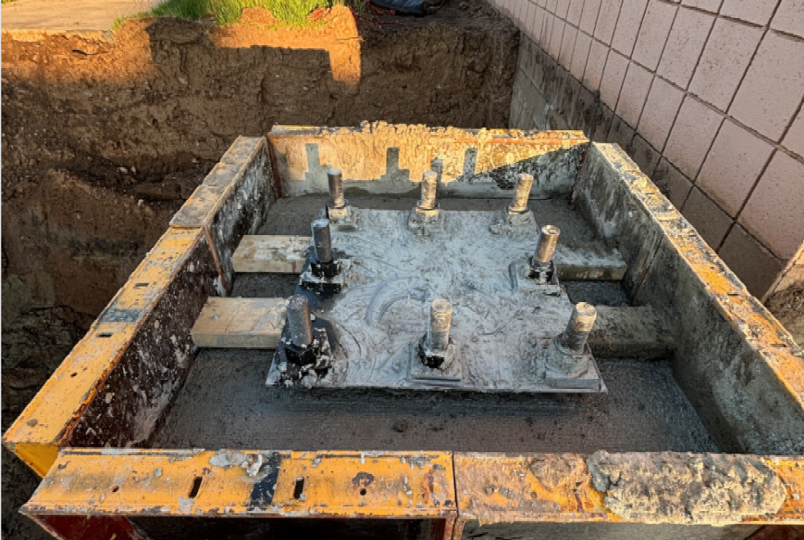 The anchor bolts for the addition vestibule have been cast into the concrete awaiting steel installation.