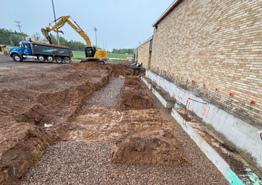 Work on site over the past few weeks has continued with a lot of concrete work taking place. All footings and foundation walls for the west, south, and east sides of the addition have been poured and had forms striped. Masonry work has also started work with the concrete block walls in the wood shop. Those walls have been completed, and the masons have transitioned to setting block on the south face of the new addition. Along with the work on the addition continuing, in the next few weeks, crews will move inside of the middle school and start work on demolishing the existing locker rooms and wood shop.