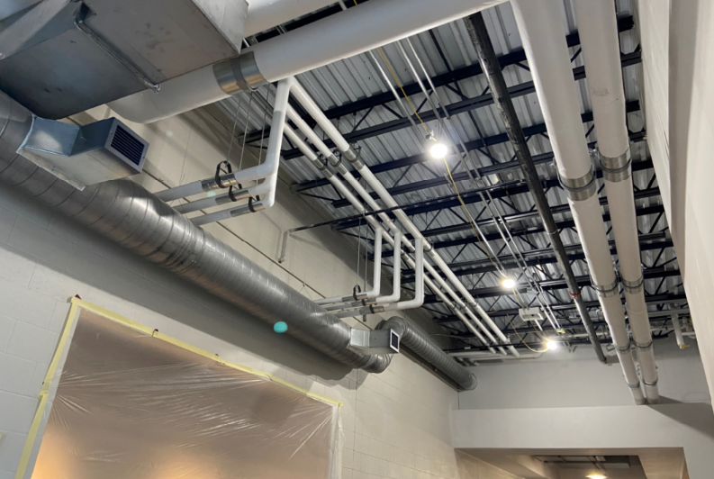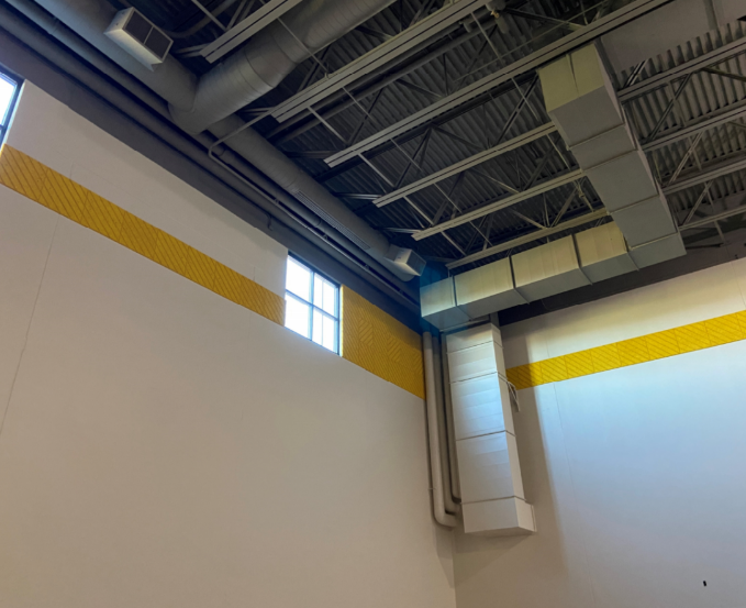After completing all overhead mechanical, electrical, and plumbing work, the gym ceiling was ready for painting. To avoid the time-consuming process of masking and covering surfaces that shouldn’t be painted, a specialized product called Dryfall paint was used. Dryfall is a spray-applied coating that adheres like standard paint, but its overspray dries almost instantly. By the time it reaches the floor, it has fully dried and can be swept away immediately.