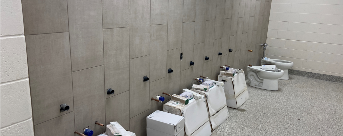 Finishes have begun in the corridor and bathrooms as well. The tile walls in each bathroom have been installed while the plumbers following right behind with bathroom fixtures. The corridor paint is ongoing as the space starts to gain some color.