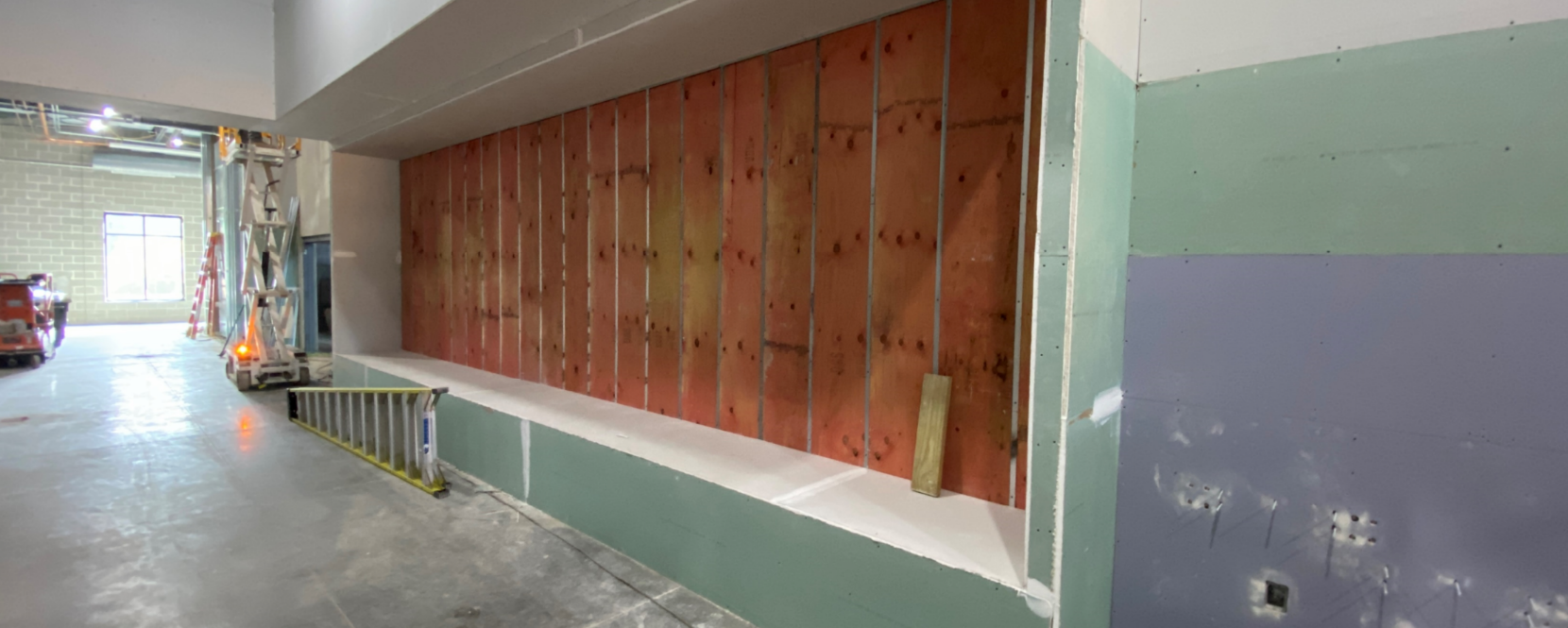 The trophy case framing and blocking have been completed in the new addition corridor.